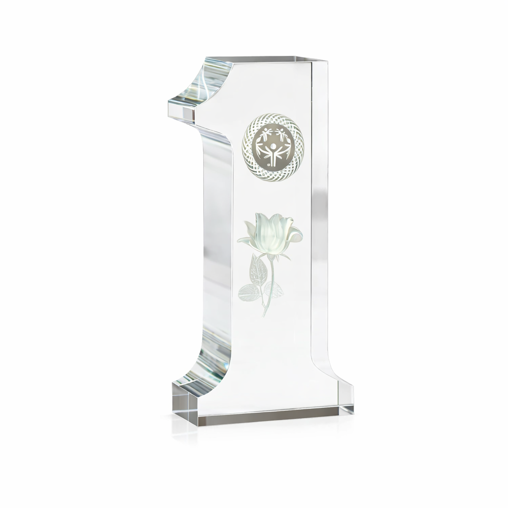 Engraved Number One Crystal Glass Trophy crafted from premium crystal, symbolizing excellence and achievement. Ideal for corporate awards and recognition events, presented in a luxury black box with gold lock. Custom engraving and UV DTF printing available.