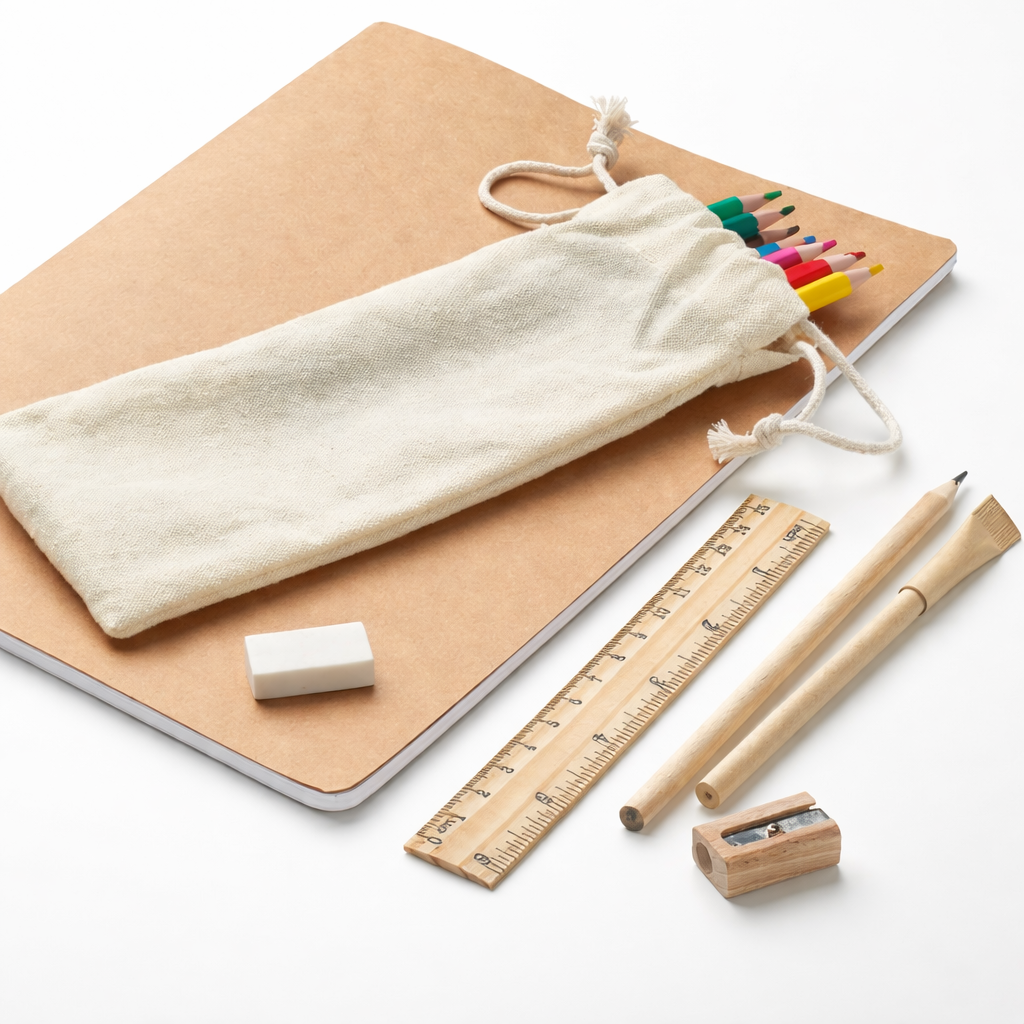 Kids drawing and 5 piece stationery set including wooden ruler, wooden sharpener, eraser, wooden pencil and cardboard ball pen. Additional 10 colouring pencils, A4 recycled paper 50 plain sheets (100 pages). Presented in cotton drawstring bag.