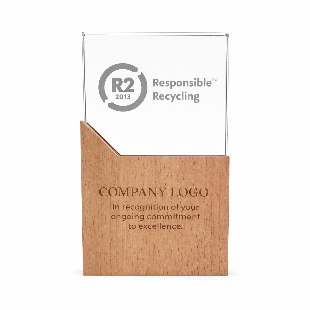 Rectangle wood and crystal award, eco-friendly and ideal for corporate recognition. Customizable with laser engraving and supplied in a gift carton box.