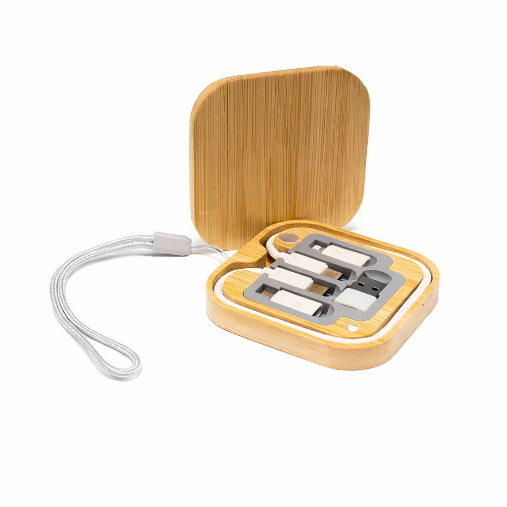 A sleek and eco-friendly Bamboo Travel Kit containing essential accessories for your devices. Compact and portable, perfect for travel enthusiasts.