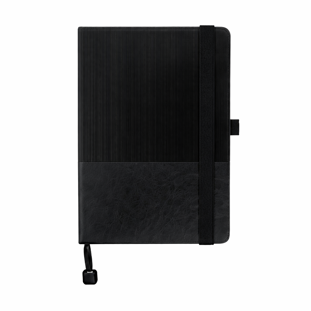 A5 hard cover PU notebook with a stylish two-toned textured design. Features 96 lined cream pages (70 gsm), elastic band closure with pen loop, and a ribbon bookmark with metal square plate. Ideal for corporate gifting, branding, and everyday professional use.