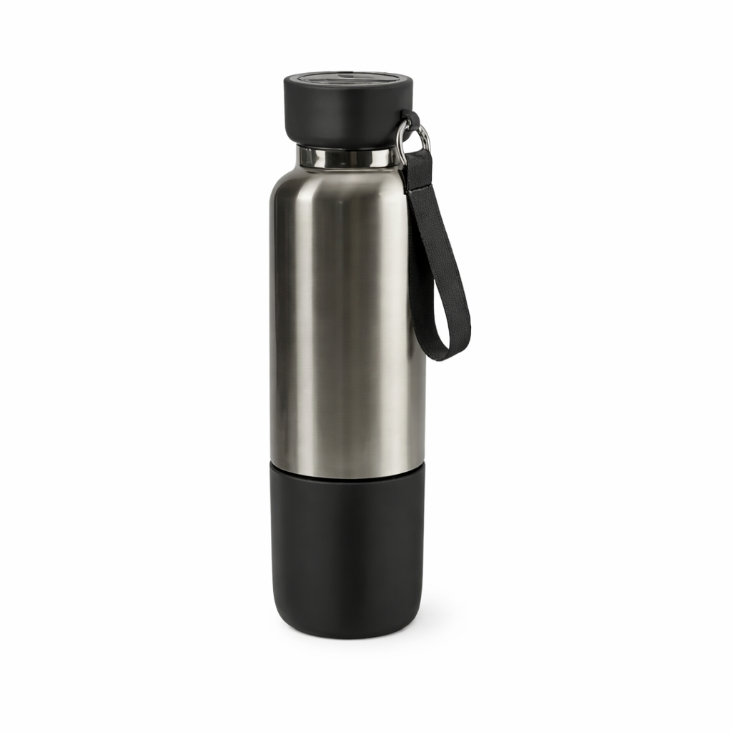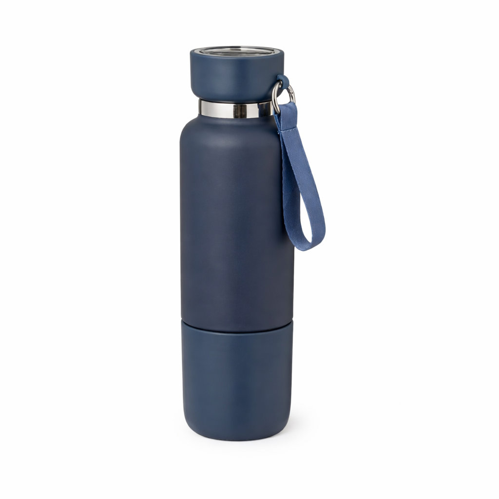 Double wall stainless steel bottle with detachable base cup and lanyard. 500 ml