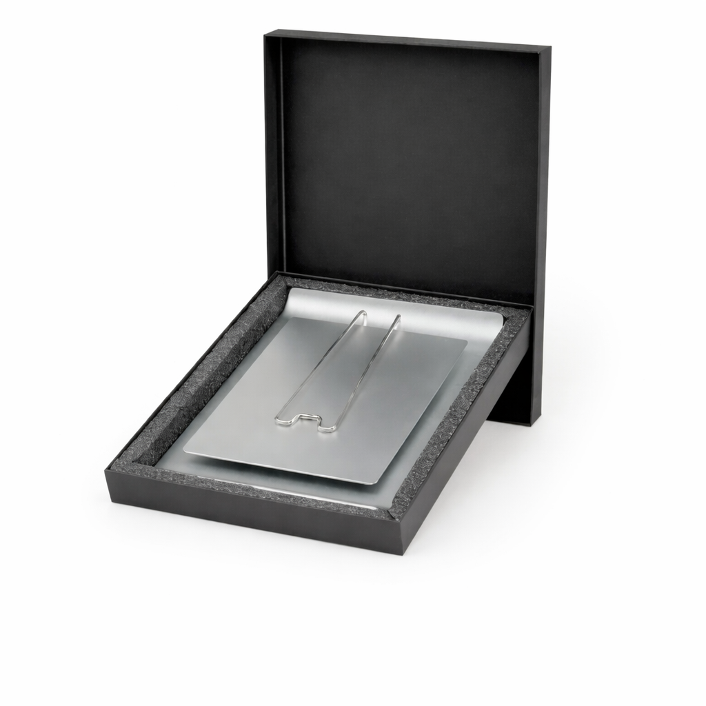 Premium A4 aluminum award plaque with an elevated A5 front panel and built-in stand. Ideal for corporate and academic recognition, supports sublimation and UV DTF printing, and comes in a black hard box with foam insert.