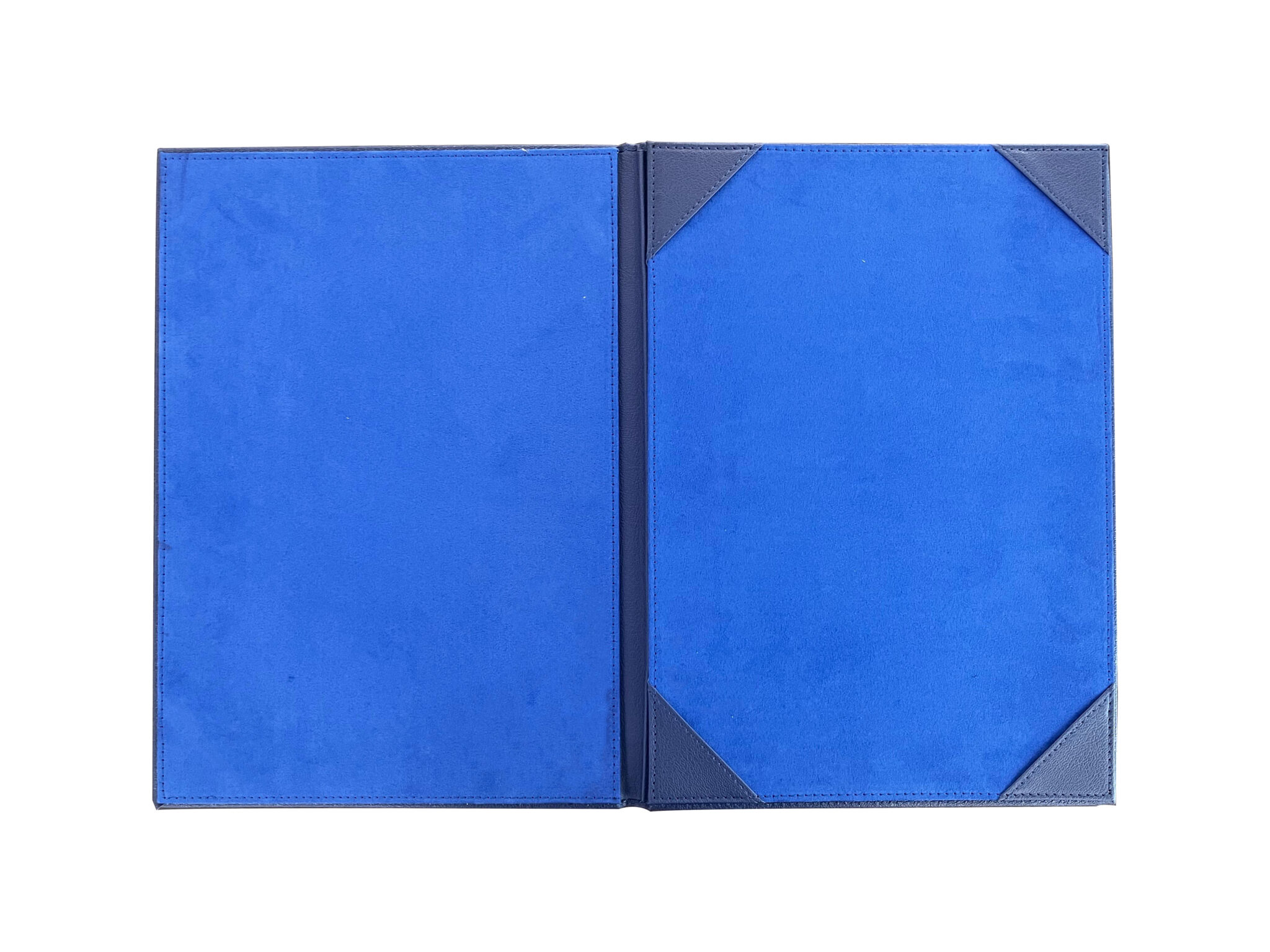 Premium document signing folder with leatherette exterior and velvet interior, ideal for professional ceremonies. Available in Black and Blue with branding options.