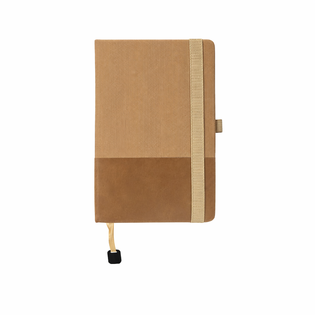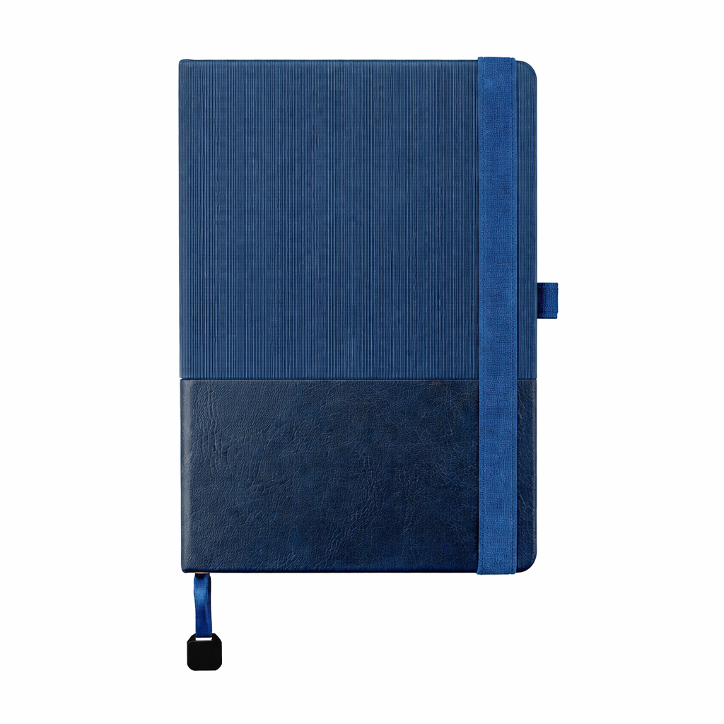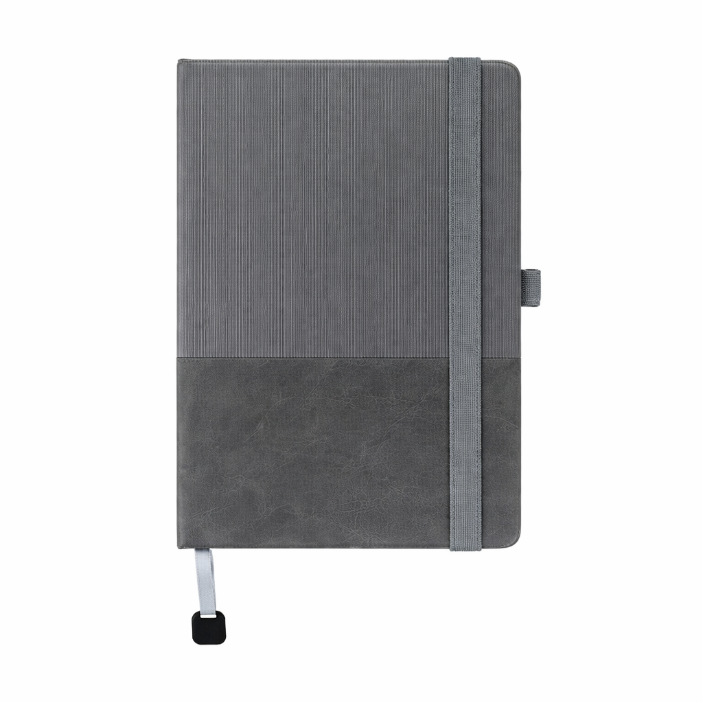 A5 hard cover PU notebook with a stylish two-toned textured design. Features 96 lined cream pages (70 gsm), elastic band closure with pen loop, and a ribbon bookmark with metal square plate. Ideal for corporate gifting, branding, and everyday professional use.