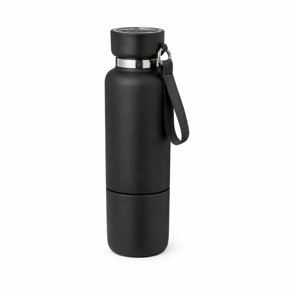 Double wall stainless steel bottle with detachable base cup and lanyard. 500 ml